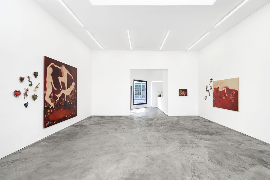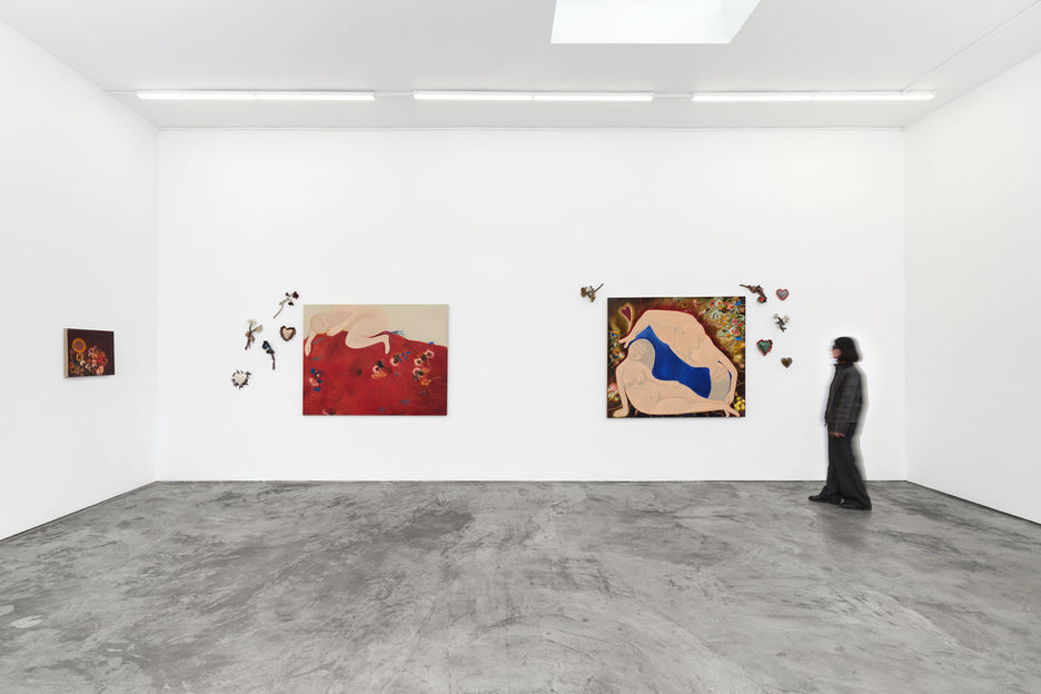 The exhibition includes a series of paintings in which figures appear suspended within soft, atmospheric grounds, surrounded by flowers and embodying curving, embryonic forms, a visual language that evokes a state of becoming. Two accompanying ceramic series, one of flowers, the other of hearts, extend these motifs into three dimensions, as though elements from the paintings have blossomed within the room. Together, the works describe an in-between space: intimate, bodily, and devotional.